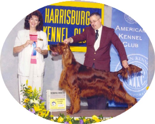 | (To the Left) Clyde taking reserve to a 4 point major at supported entry at Harrisburg, PA under Breeder Judge Sheila Smith. |