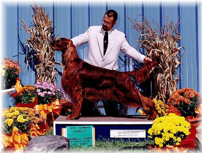 | Champion Pella's Partner in Crime finishing his championship by going winners dog for a Major at the Trumbull County Kennel Club show September 21, 2003. His son Pella's Land Shark was Reserve Winners Dog on the same day. |