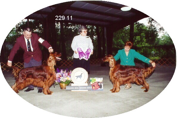 right) stealing the show at the Irish Setter Club of Jacksonville Specialty Show. Buster was Winners