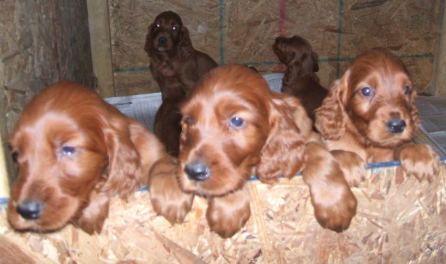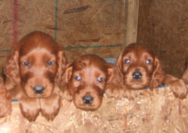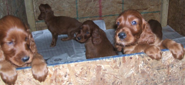 Three of our Pella Winter Litter peeking over the edge of the puppy box at 6